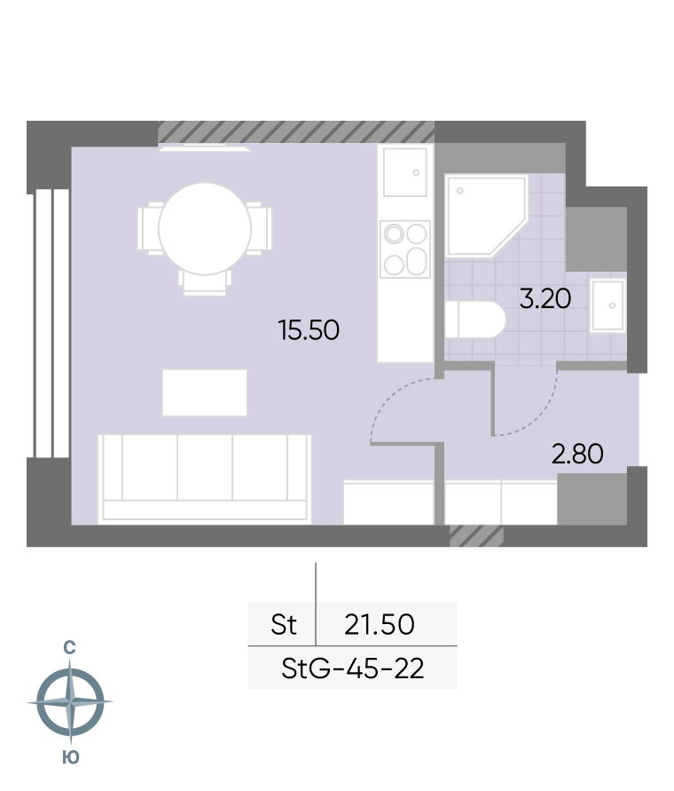 общая 21,5 м2, жилая 10,6 м2, кухни 4,9 м2 |