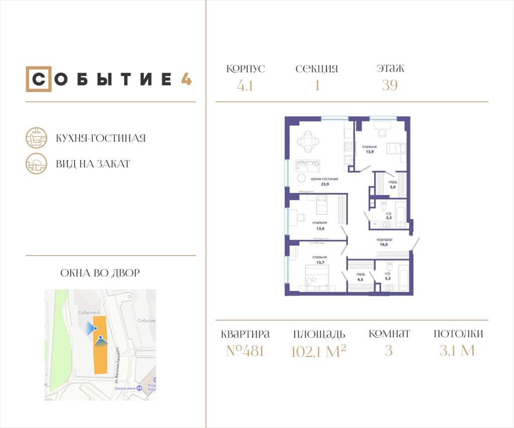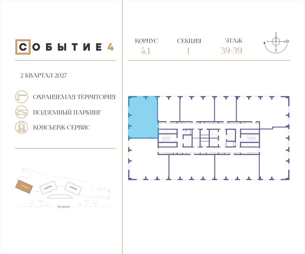 | Продаётся 3-комнатная квартира от застройщика: общая площадь 102.10 м, жилая 43.20 м, кухня 23.90 м, 39-й этаж, жилой квартал «Событие-4», корпус 1 (секция 1) Срок сдачи: 2 квартал 2027 года.