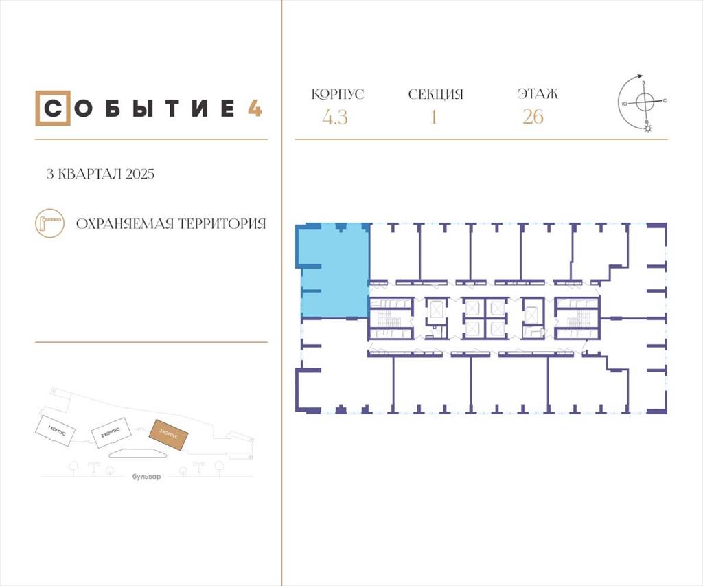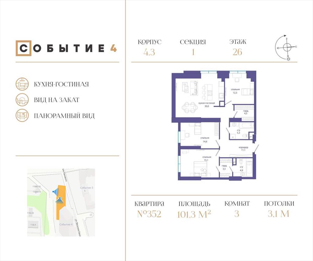 | Продаётся 3-комнатная квартира от застройщика: общая площадь 101.30 м, жилая 42.00 м, кухня 30.00 м, 26-й этаж, жилой квартал «Событие-4», корпус 3 (секция 1) Срок сдачи: 3 квартал 2025 года.