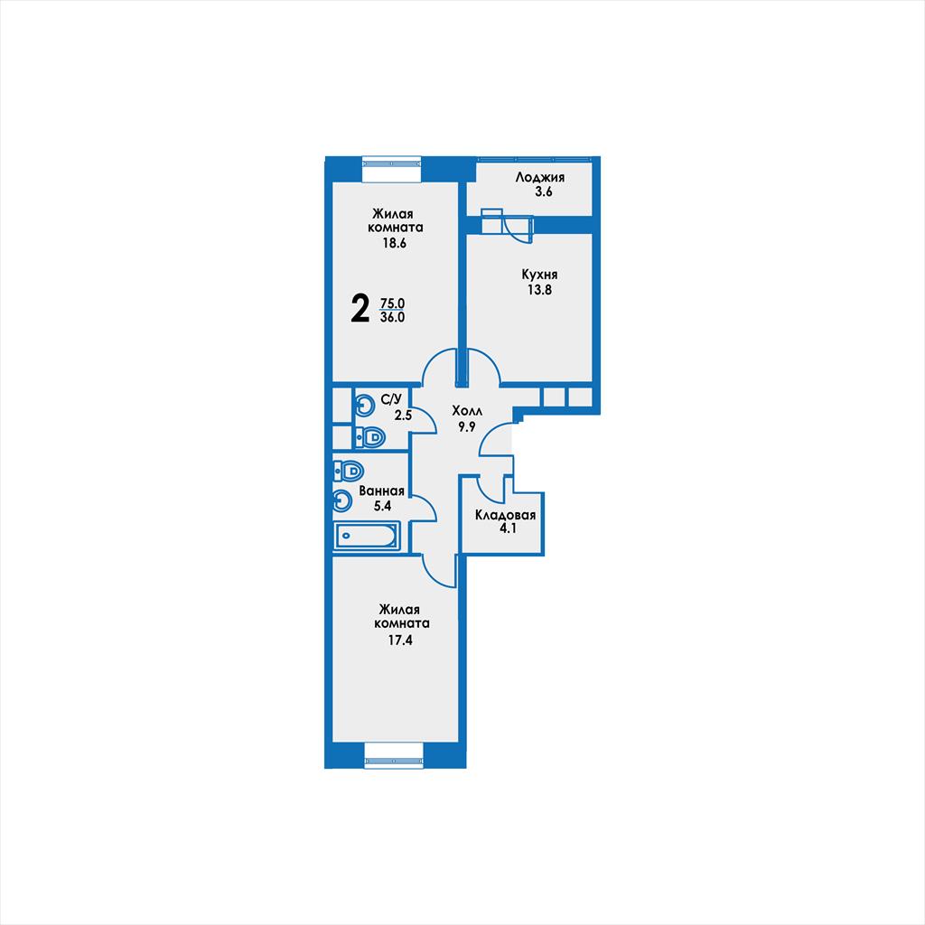 общая 75,9 м2, жилая 36 м2, кухни 14 м2 |
