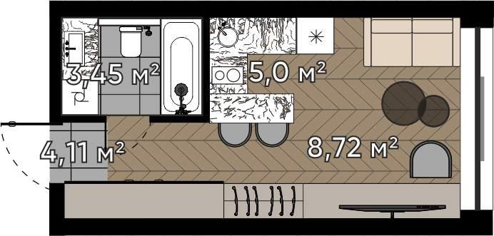 общая 21,28 м2, жилая 8,72 м2, кухни 5 м2 |