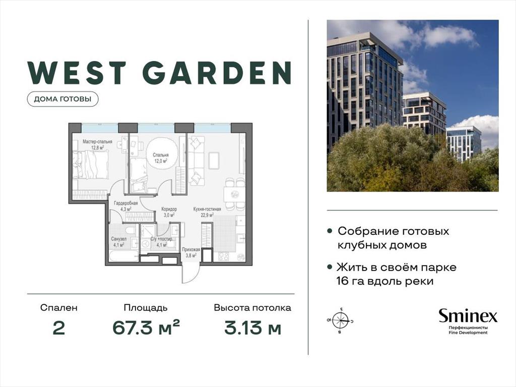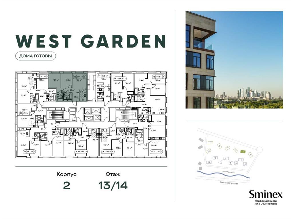 West Garden - это собрание клубных домов высотой 12-14 этажей в собственном парке 16 гектаров вдоль реки. Просторный среднеэтажный квартал расположен на Минской улице, в респектабельном Западном округе столицы. Вокруг премиальное окружение и более 1000 гектаров парков.