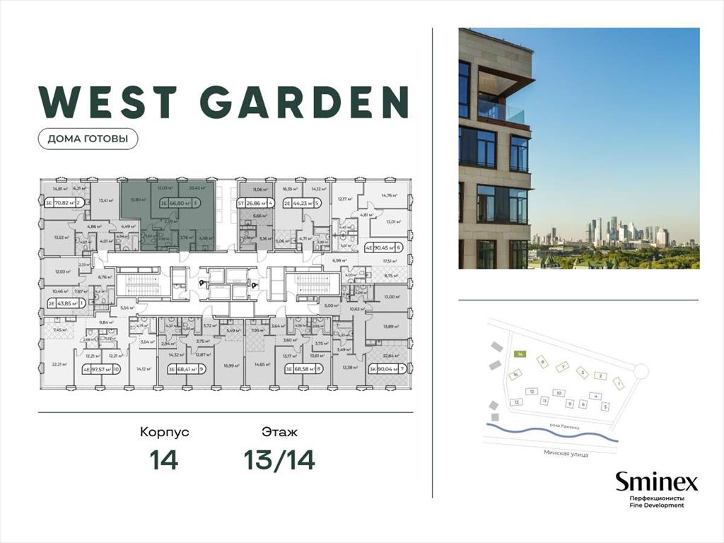 West Garden - это собрание клубных домов высотой 12-14 этажей в собственном парке 16 гектаров вдоль реки. Просторный среднеэтажный квартал расположен на Минской улице, в респектабельном Западном округе столицы. Вокруг премиальное окружение и более 1000 гектаров парков.