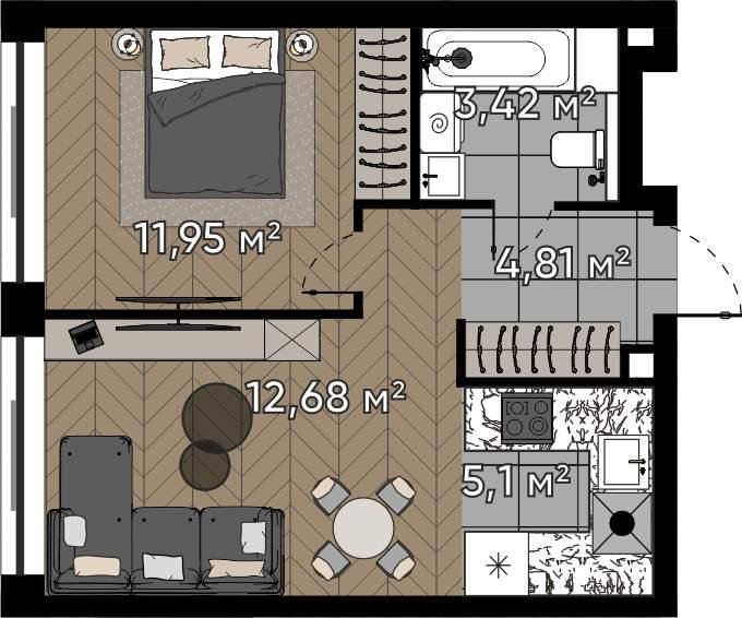 общая 37,96 м2, жилая 24,63 м2, кухни 5,1 м2 |