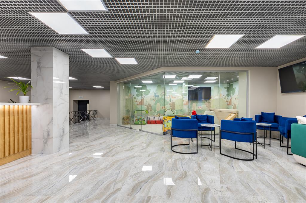 - В холле расположено лобби со стойкой ресепшн и лаунж зоны. При входе предусмотрено место хранения детского транспорта и колясок