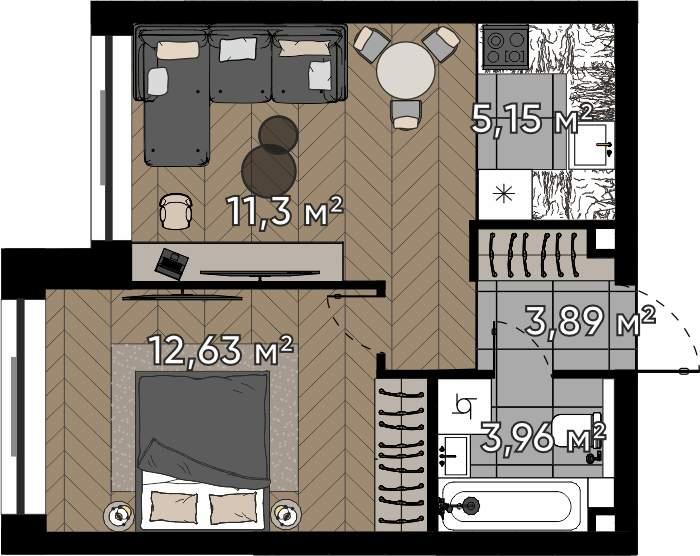 общая 36,93 м2, жилая 23,93 м2, кухни 5,15 м2 |