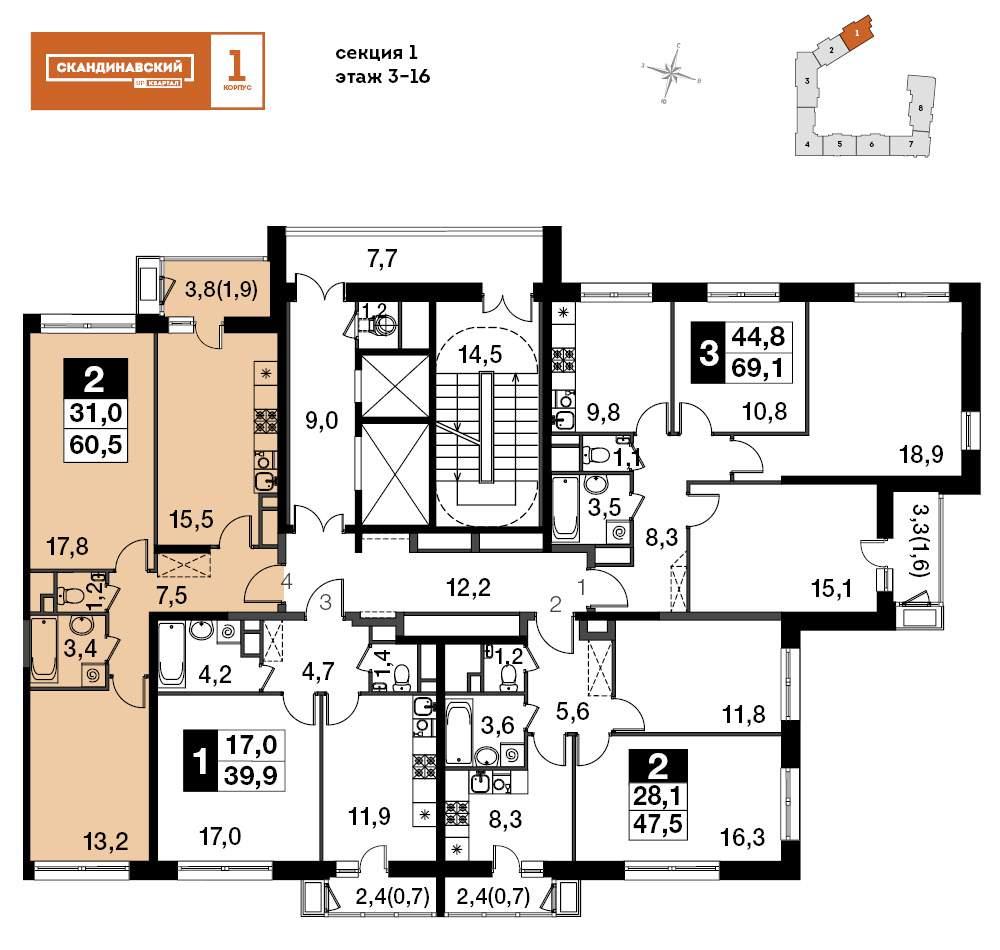 Продаётся 2-к квартира №8 в сданном корпусе общей площадью 60.5 кв. м на 3-м этаже 16 этажного дома.