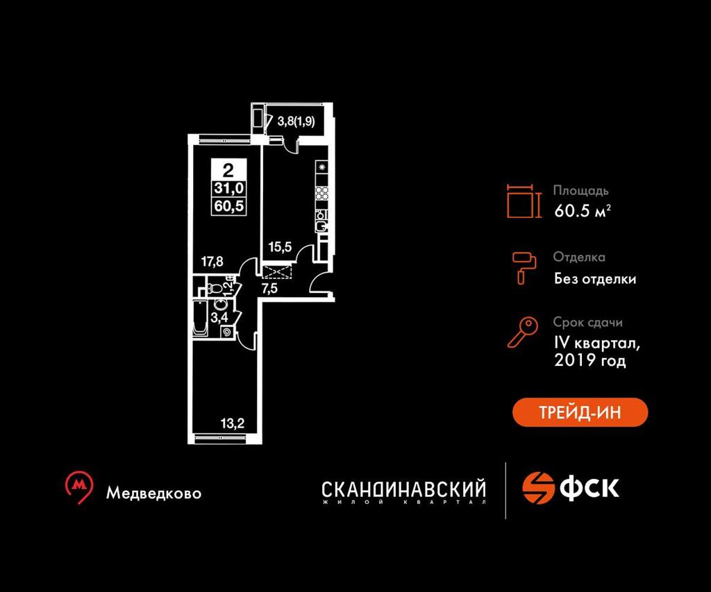 общая 60,5 м2, жилая 31 м2, кухни 15,5 м2 |