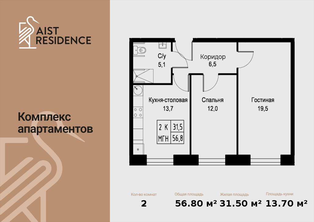 общая 56,8 м2, жилая 31,5 м2, кухни 13,7 м2 |