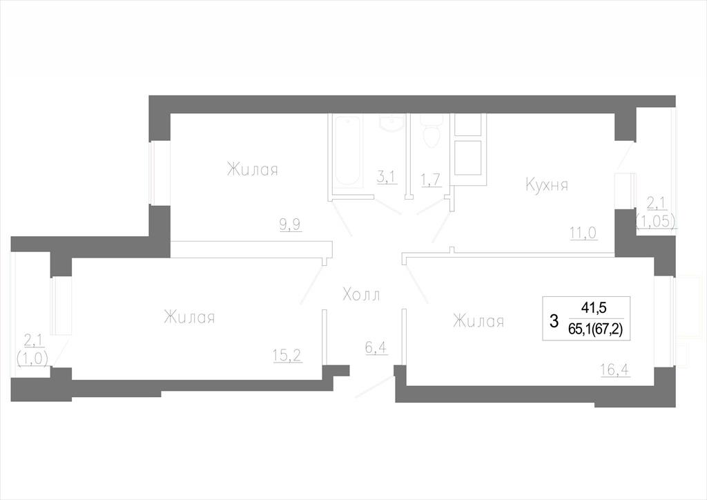 общая 68,8 м2, жилая 41,2 м2, кухни 9,3 м2 |