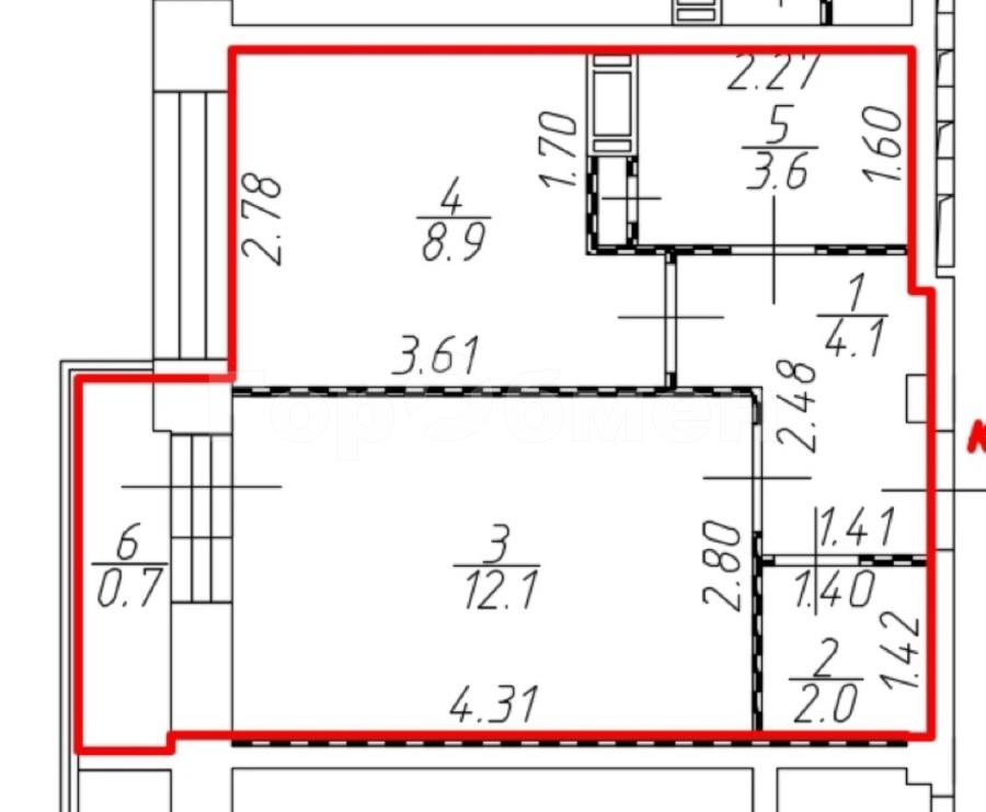 | Площадь | общая 30,7 м2, жилая 12,1 м2, кухни 8,9 м2 |