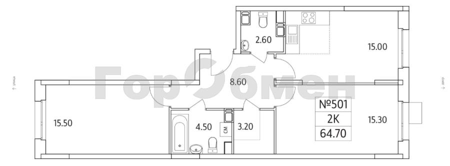 общая 64,7 м2, жилая 30,8 м2, кухни 15 м2 |