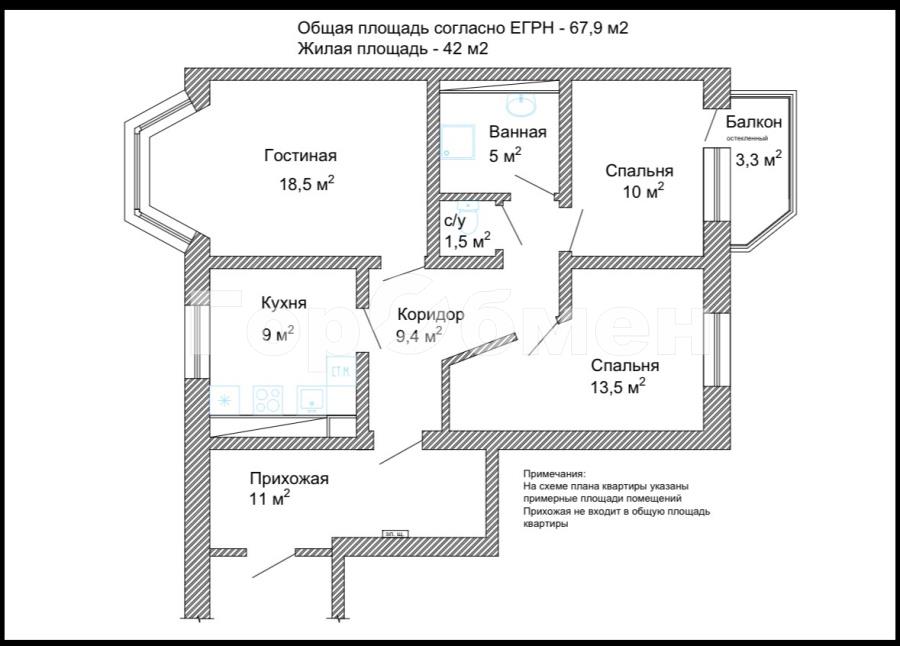общая 68 м2, жилая 42 м2, кухни 9 м2 |