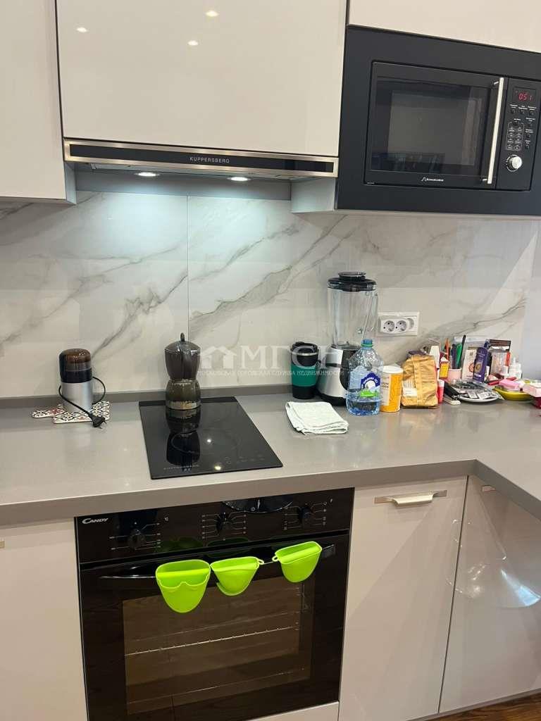 В квартире выполнен современный ремонт из качественных, натуральных отделочных материалов ( паркет и керамогранит на полу), теплый пол в ванной . Выполнена добротная шумоизоляция (что крайне важно для проживания), стены под покраску. Панормные окна. Качественные двери Profidoors. Кондиционеры. Квартира полностью меблирована современной, стильной мебелью.. Кухонный гарнитур ( от известного производителя кухонь ЗОВ ) со столешницей из керамогранита, изготовлен из высококачественных материалов по индивидуальному проектному решению. Также по индивидуальному заказу изготовлены все шкафы, диван и кровать.
