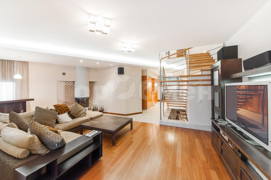 Планировка представляет собой два уровня общей площадью 224,4 кв.м с великолепными видами на город и дизайнерской отделкой.