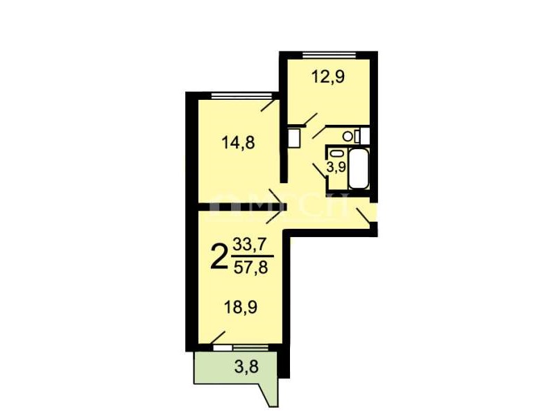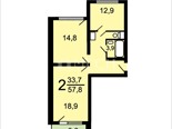 - общая площадь 58,3 кв. м., жилая площадь 34 кв. м. (19, 15 кв. м., изолированные), кухня 10 кв. м., с/у разд.