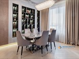 - обеденная зона представлена больший столом с мраморной столешницей, сделанной по индивидуальному проекту и удобными стульями;