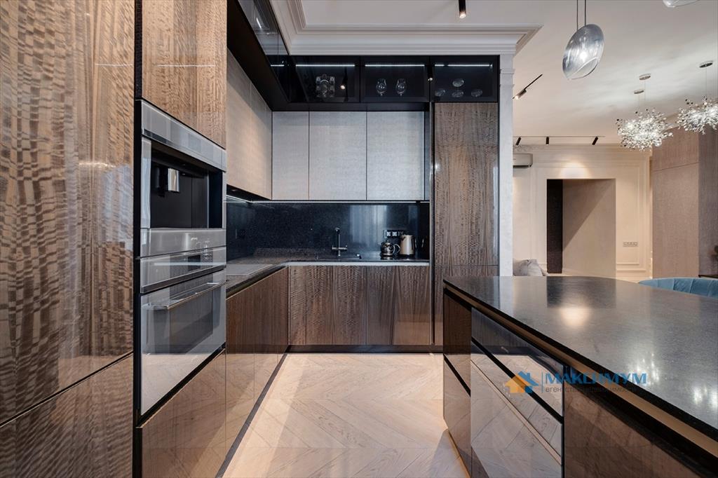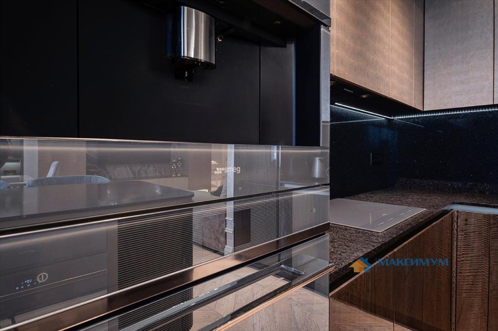 - зона кухни представлена кухонным гарнитуром и островом выполненным по индивидуальному заказу, с дизайнерскими фасадами и встроенной техникой SMEG;