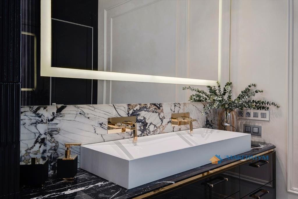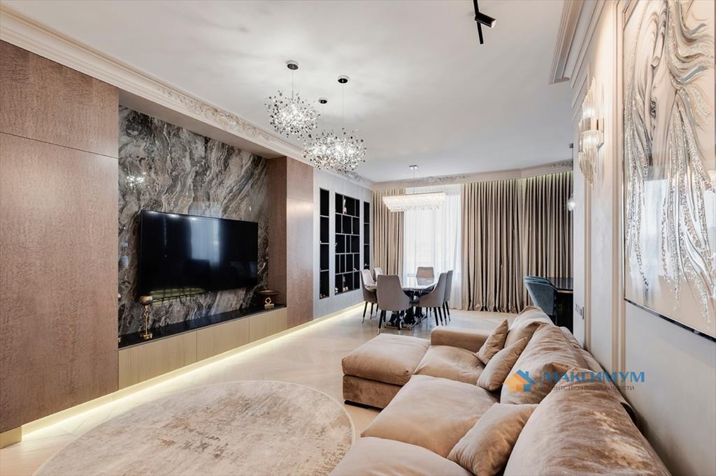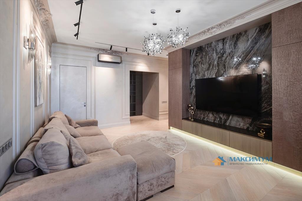 - в гостиной представлен шикарный диван, большой телевизор расположенный на стене, отделанной мрамором. Продуманна независимая подсветка всех зон;