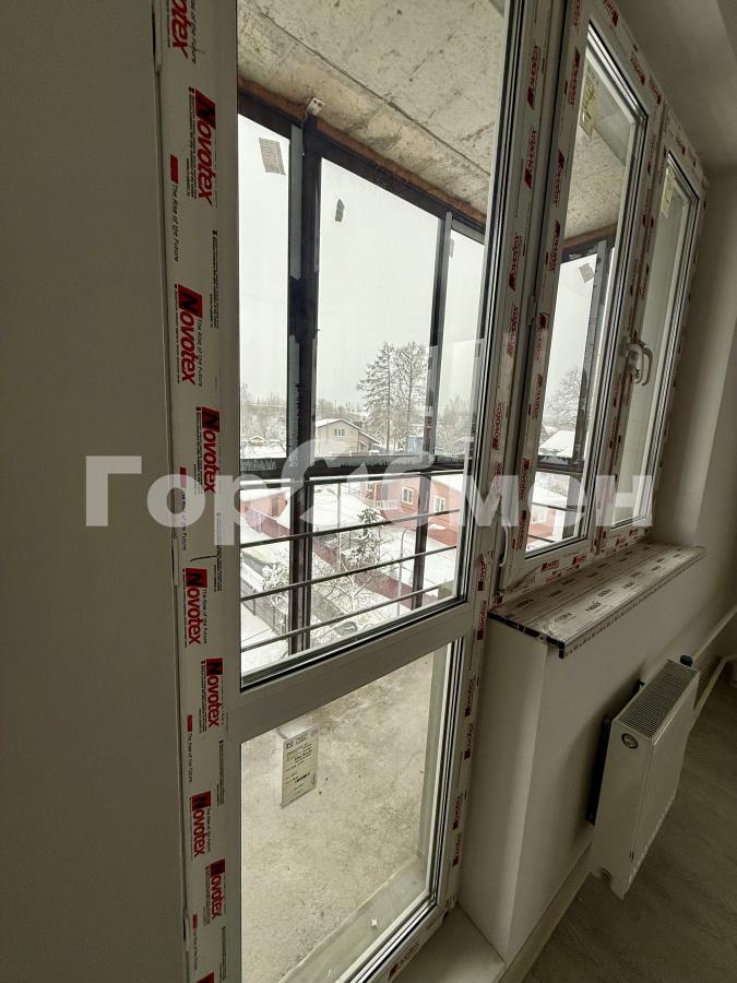 Гостиная с двумя окнами и большим застекленным балконом.