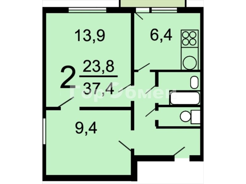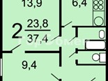 общая 37,7 м2, жилая 24 м2, кухни 6,4 м2 |
