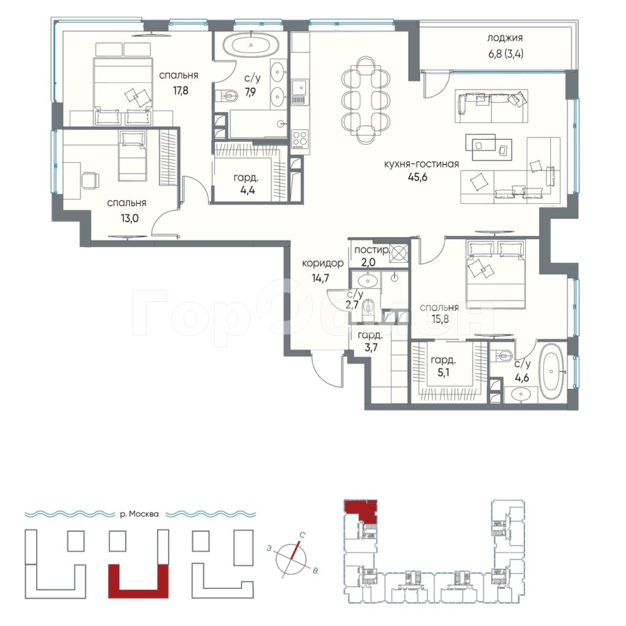 Идеальное планировочное решение с проработанной эргономикой пространства: просторная кухня-гостиная 45,6 м2, три спальни 17,8/13/15,8 м2, три гардеробных-комнаты, три с/у, коридор и большая лоджия с панорамным остеклением.