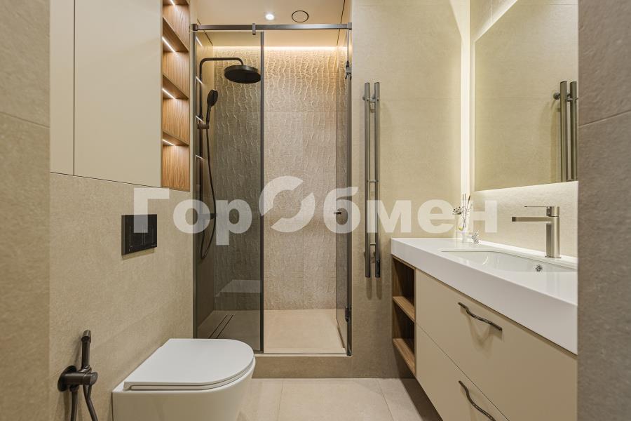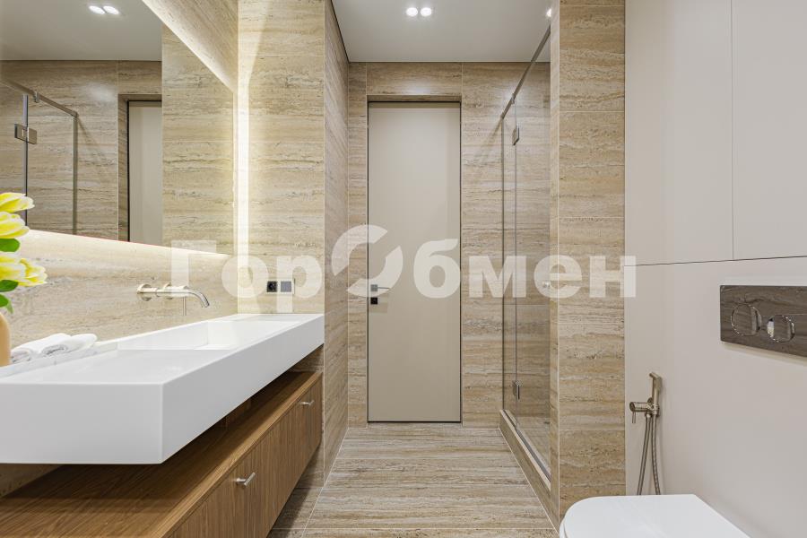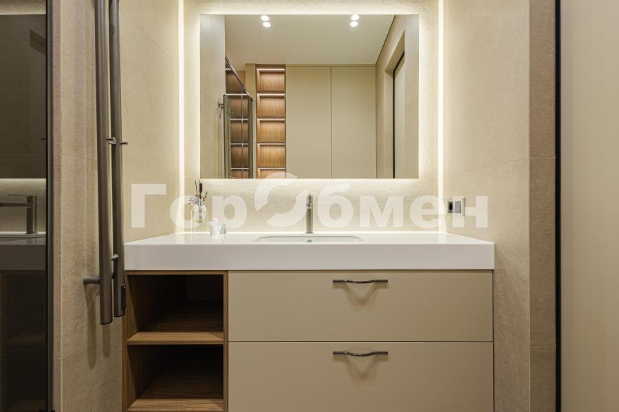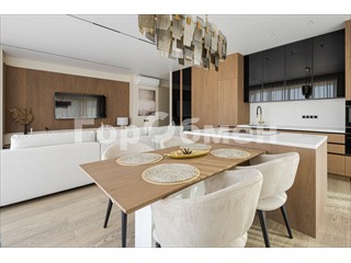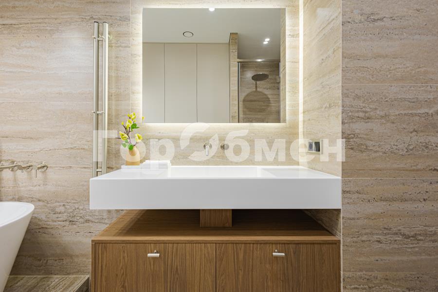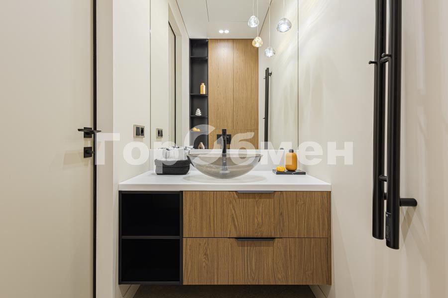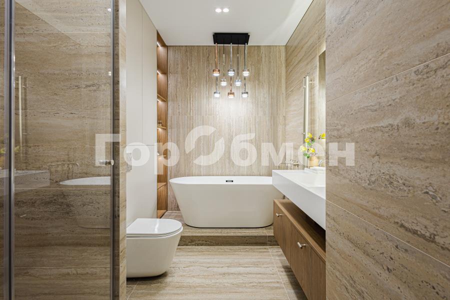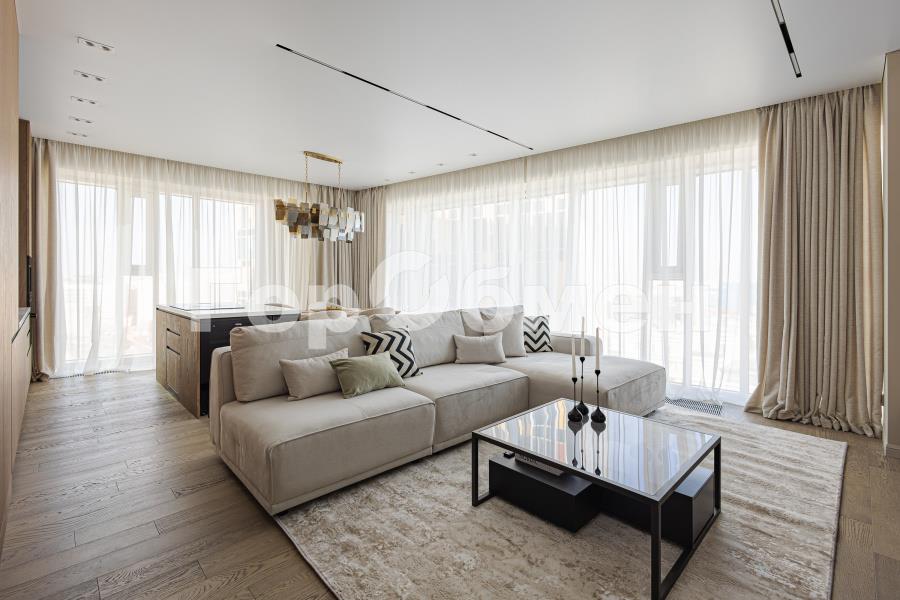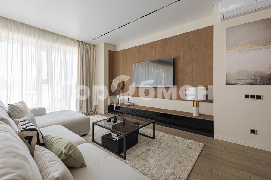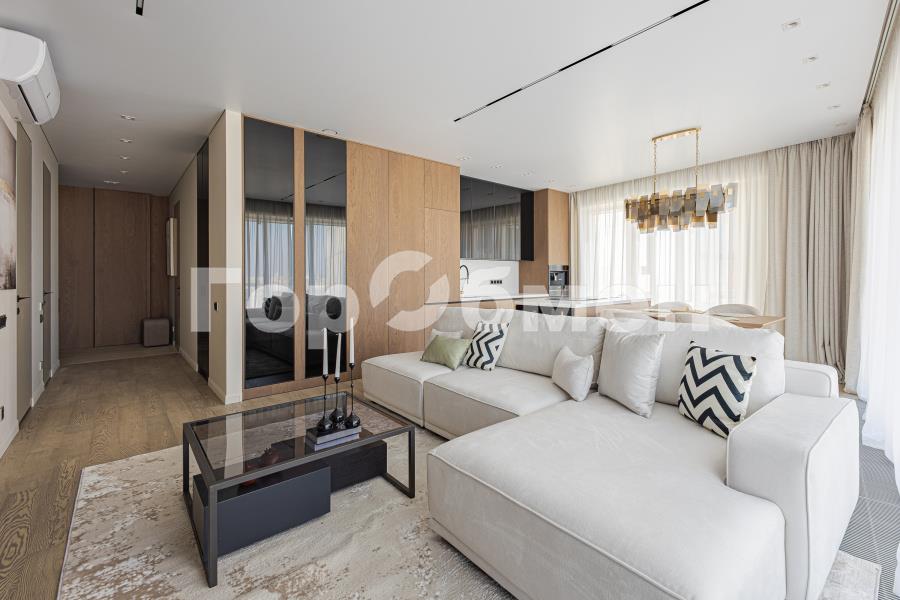 Выполнен дорогой дизайнерский ремонт с использованием натуральных материалов. Премиальная мебель, техника, натуральное дерево, панорамные окна — квартира создаёт ощущение современного городского шика.