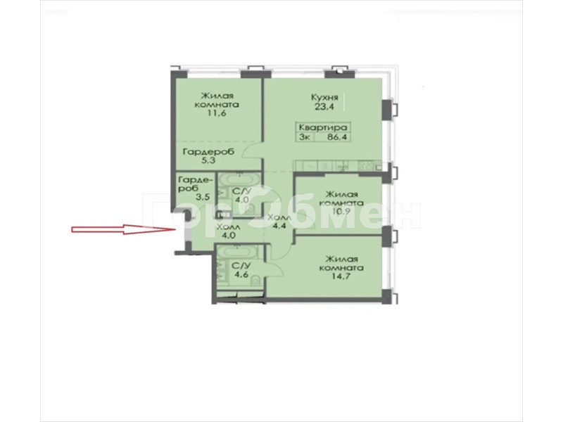 общая 86,4 м2, жилая 38 м2, кухни 25 м2 |