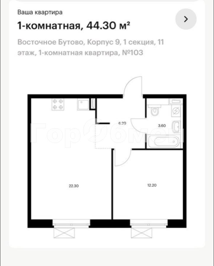 - общая площадь 44,3 кв. м;