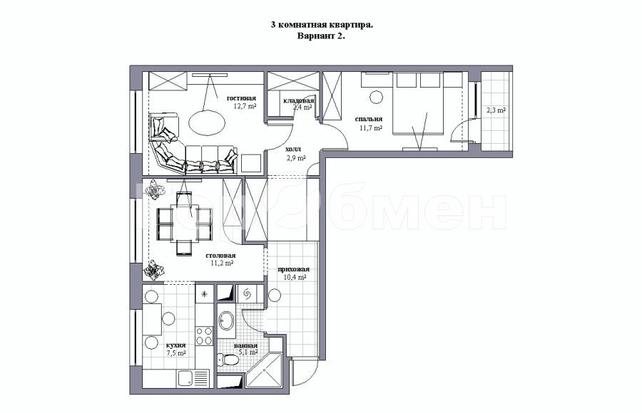 общая 60 м2, жилая 44,4 м2, кухни 6 м2 |