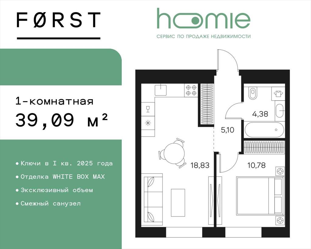 Продается 1-комн. квартира с первичной отделкой в ЖК "FORST" на 10 этаже. Общая площадь: 39.09 кв.м. , жилая: 10.78 кв.м. , площадь просторной кухни-столовой: 18.83 кв.м. Все окна выходят на одну сторону. В квартире один совмещенный санузел. Высота потолков 2.85 м.