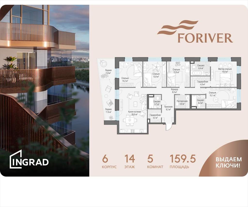 общая 159,5 м2, жилая 72,9 м2, кухни 15,7 м2 |