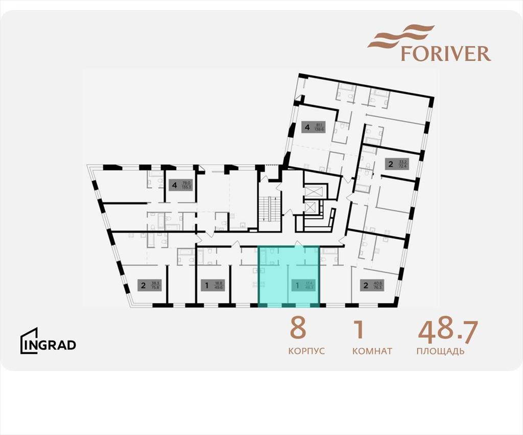 | В жилом квартале, расположенном в Даниловском районе Москвы, продаётся 1-комнатная квартира площадью 48.70 кв. м без отделки. Квартира расположена на 9 этаже 14-этажного дома, корпус 8, в жилом квартале бизнес-класса Foriver. .