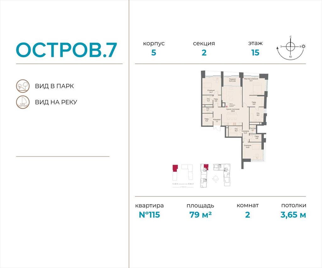 | Продаётся 2-комн. квартира от застройщика: общая площадь 79.00 м, жилая м, кухня м, 15-й этаж, жилой квартал «Остров 7», корпус 5 (секция 2) . Срок сдачи: 3 квартал 2028 года.