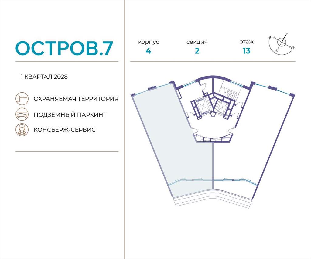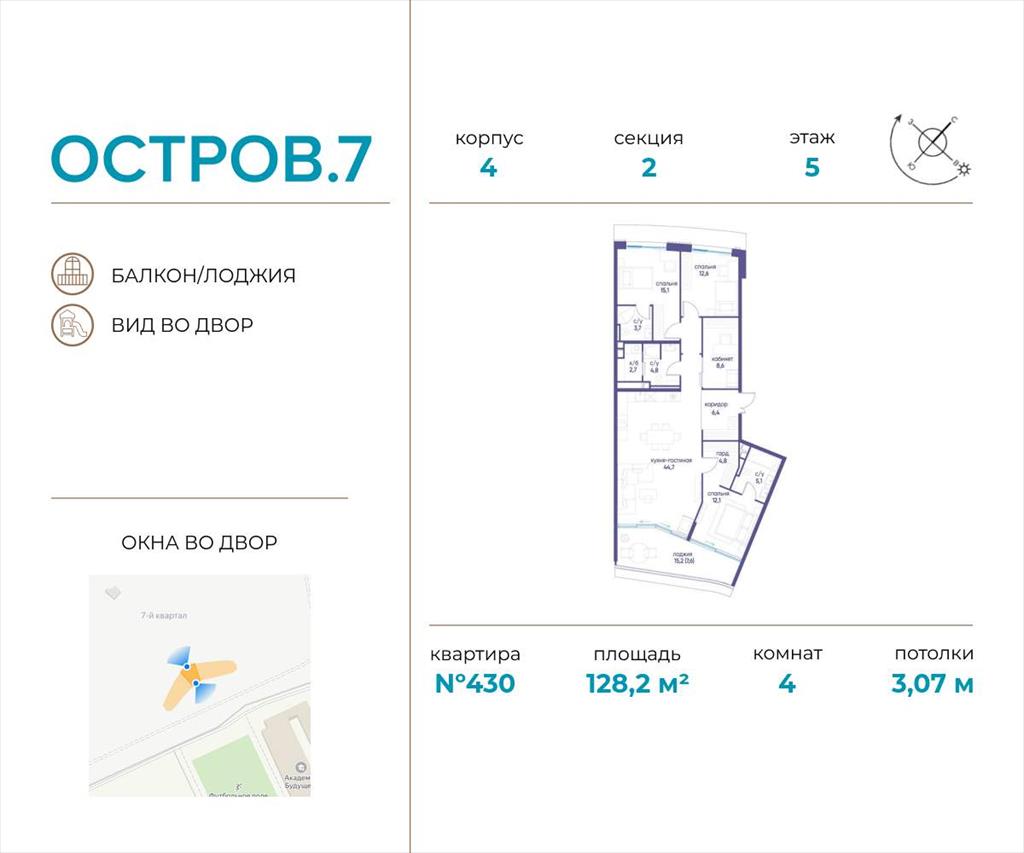 | Продаётся 4-комн. квартира от застройщика: общая площадь 128.20 м, жилая 48.40 м, кухня 44.70 м, 5-й этаж, жилой квартал «Остров 7», корпус 4 (секция 2) . Срок сдачи: 1 квартал 2028 года.
