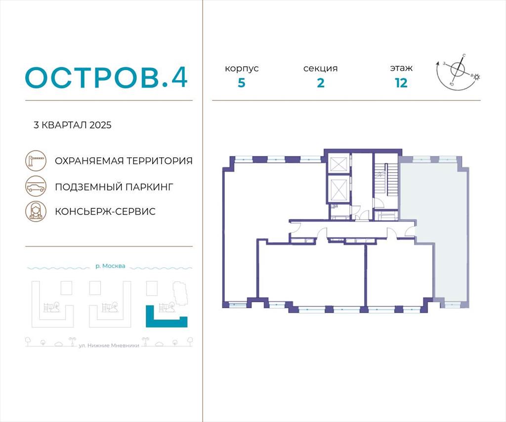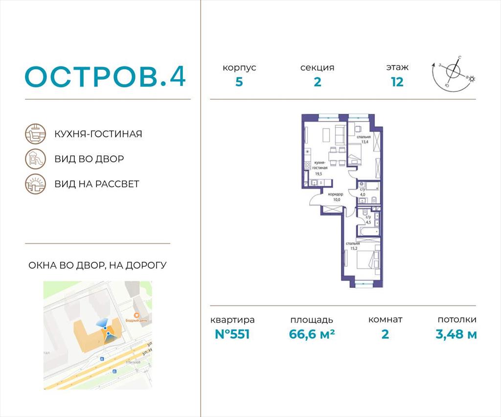 Продаётся 2-комн. квартира от застройщика: общая площадь 66.60 м, жилая 28.60 м, кухня 19.50 м, 12-й этаж, жилой квартал «Остров 4», корпус 5 (секция 2) . Срок сдачи: 3 квартал 2025 года.