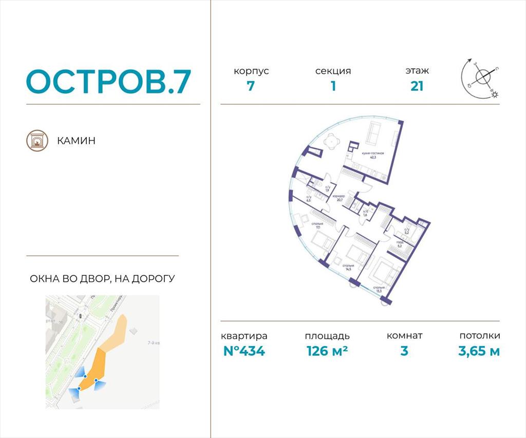 | Продаётся 3-комн. квартира от застройщика: общая площадь 126.00 м, жилая 44.90 м, кухня 42.30 м, 21-й этаж, жилой квартал «Остров 7», корпус 7 (секция 1) . Срок сдачи: 3 квартал 2028 года.