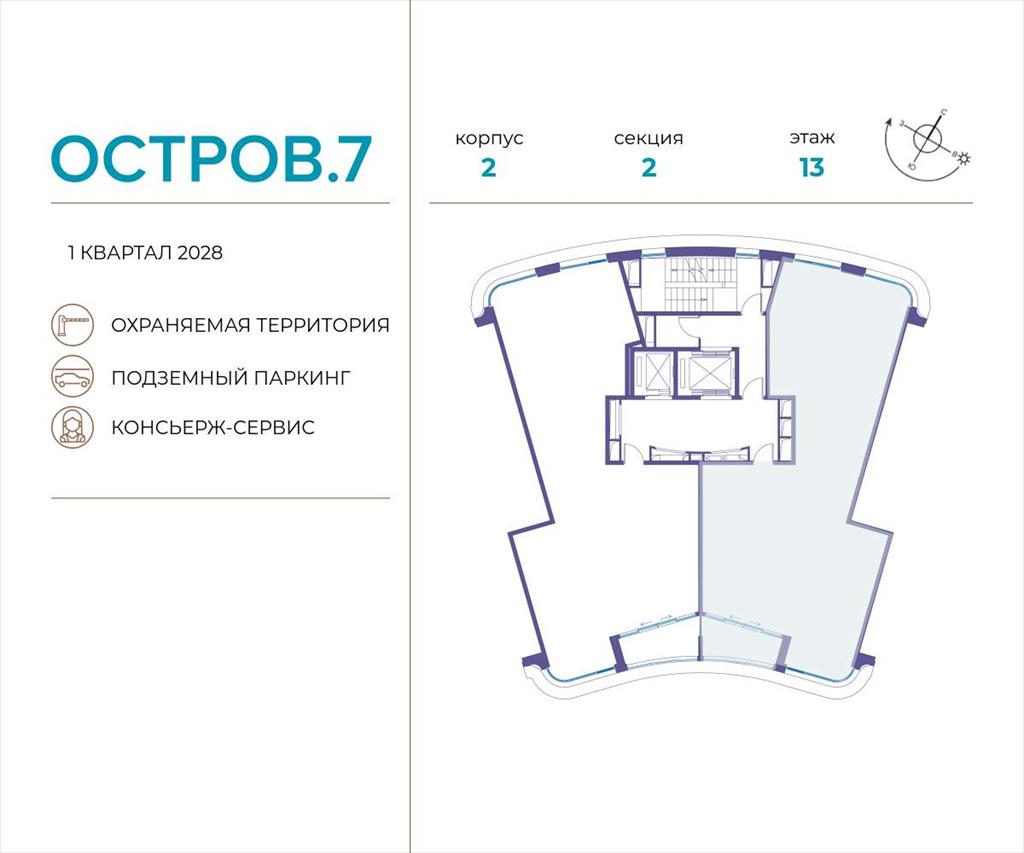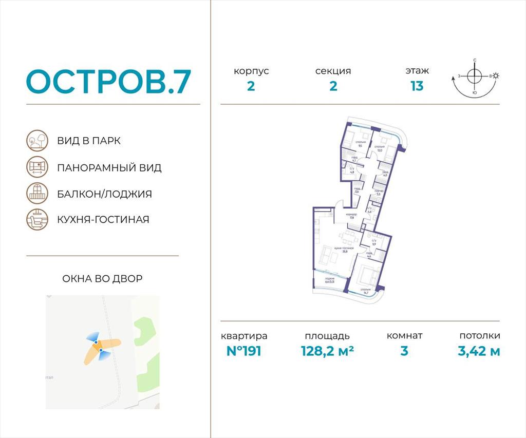 | Продаётся 3-комн. квартира от застройщика: общая площадь 128.20 м, жилая 36.20 м, кухня 35.80 м, 13-й этаж, жилой квартал «Остров 7», корпус 2 (секция 2) . Срок сдачи: 1 квартал 2028 года.