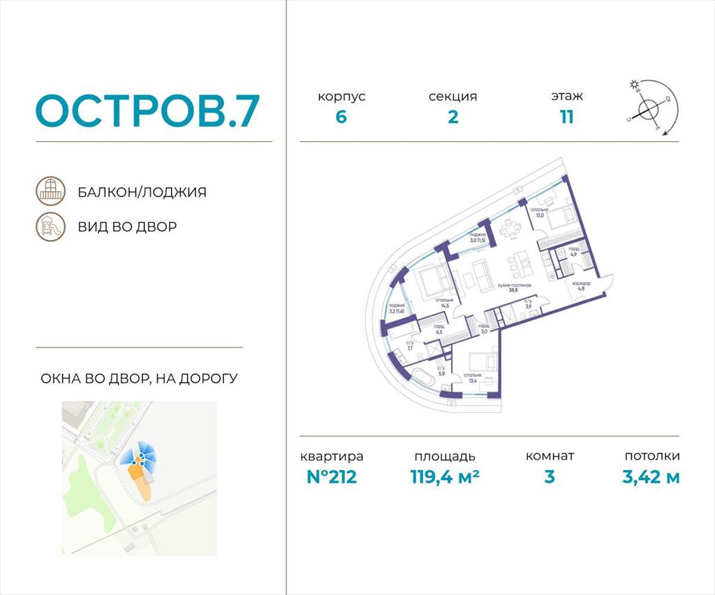 | Продаётся 3-комн. квартира от застройщика: общая площадь 119.40 м, жилая 40.90 м, кухня 38.80 м, 11-й этаж, жилой квартал «Остров 7», корпус 6 (секция 2) . Срок сдачи: 3 квартал 2028 года.