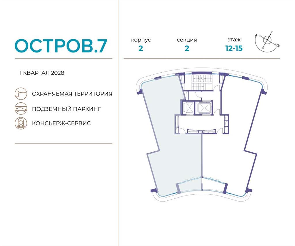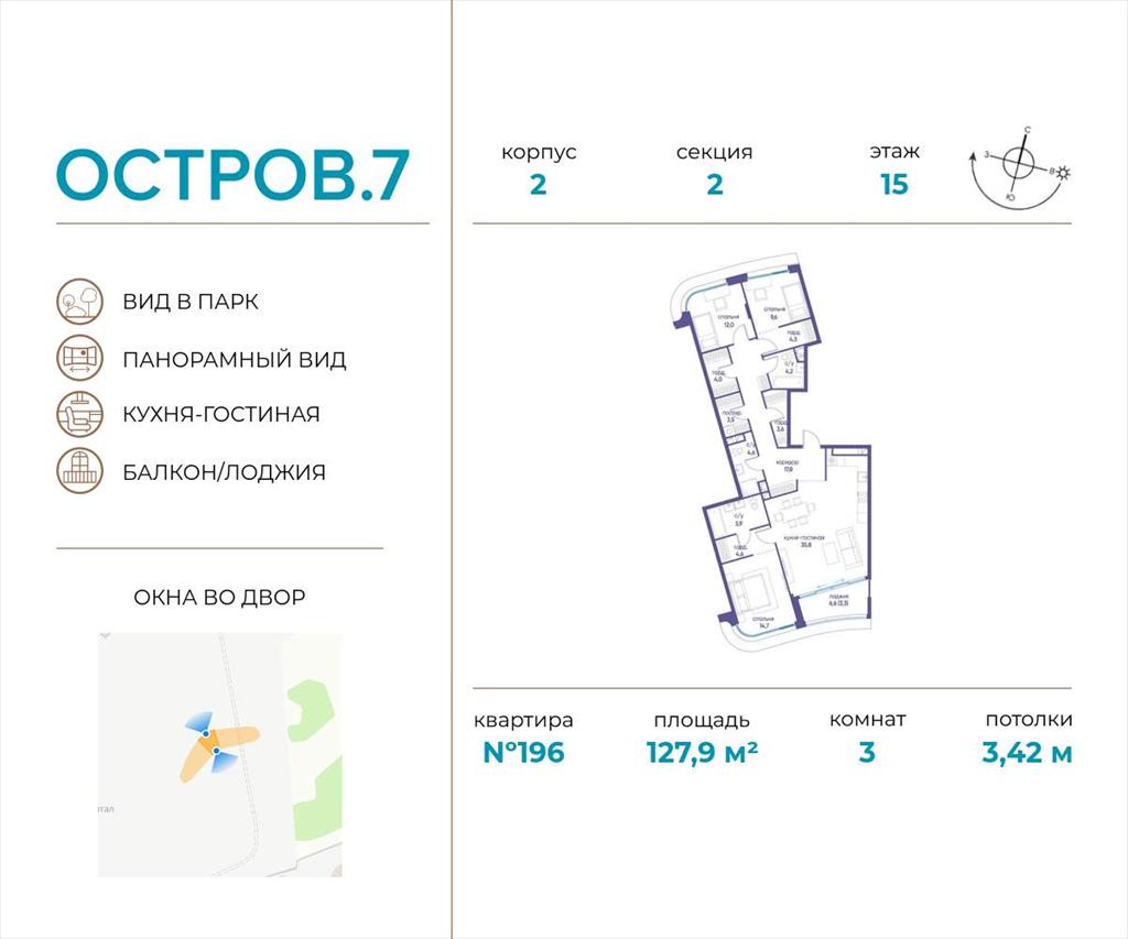 | Продаётся 3-комн. квартира от застройщика: общая площадь 127.90 м, жилая 36.30 м, кухня 35.80 м, 15-й этаж, жилой квартал «Остров 7», корпус 2 (секция 2) . Срок сдачи: 1 квартал 2028 года.