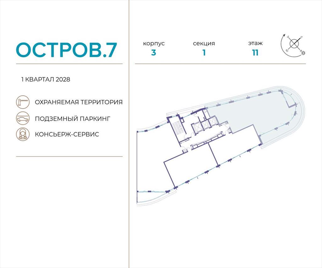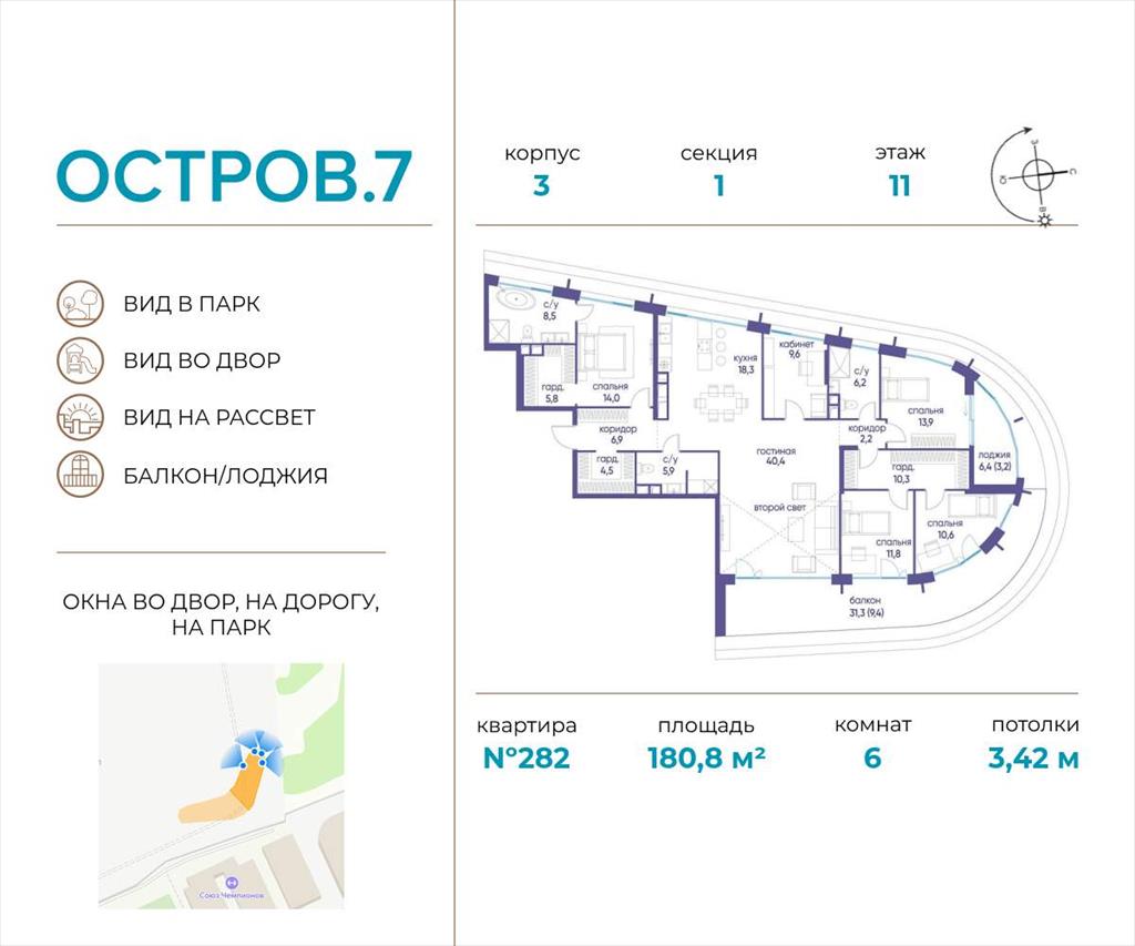 | Продаётся квартира от застройщика: общая площадь 180.80 м, жилая 59.90 м, кухня 58.70 м, 11-й этаж, жилой квартал «Остров 7», корпус 3 (секция 1) . Срок сдачи: 1 квартал 2028 года.
