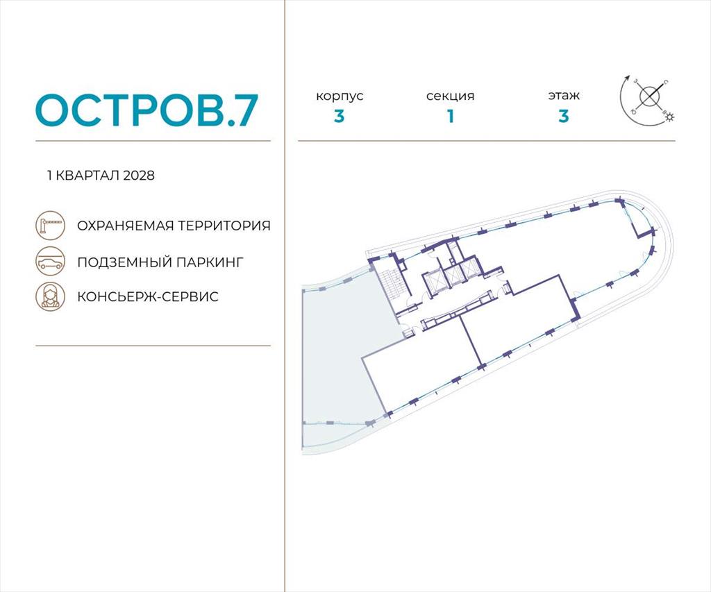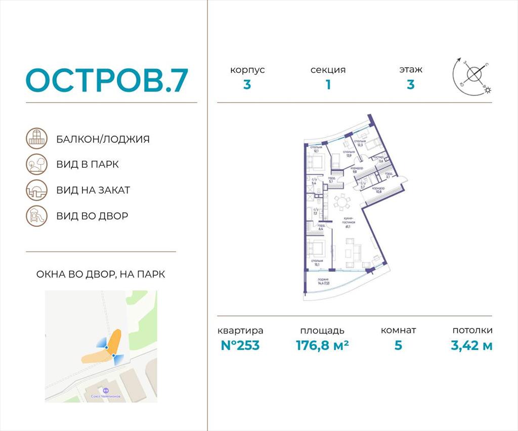 | Продаётся квартира от застройщика: общая площадь 176.80 м, жилая 53.40 м, кухня 61.10 м, 3-й этаж, жилой квартал «Остров 7», корпус 3 (секция 1) . Срок сдачи: 1 квартал 2028 года.
