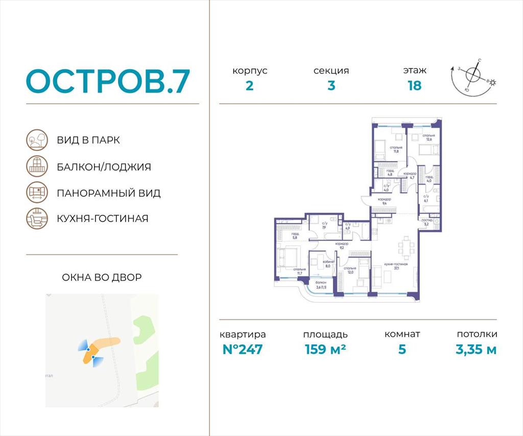 | Продаётся квартира от застройщика: общая площадь 159.00 м, жилая 56.10 м, кухня 37.10 м, 18-й этаж, жилой квартал «Остров 7», корпус 2 (секция 3) . Срок сдачи: 1 квартал 2028 года.