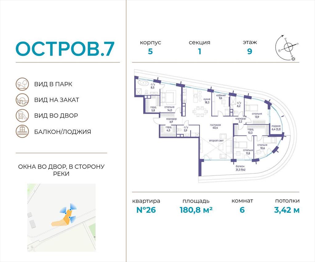 | Продаётся квартира от застройщика: общая площадь 180.80 м, жилая 59.90 м, кухня 58.70 м, 9-й этаж, жилой квартал «Остров 7», корпус 5 (секция 1) . Срок сдачи: 3 квартал 2028 года.