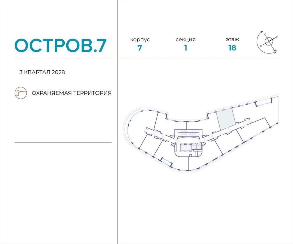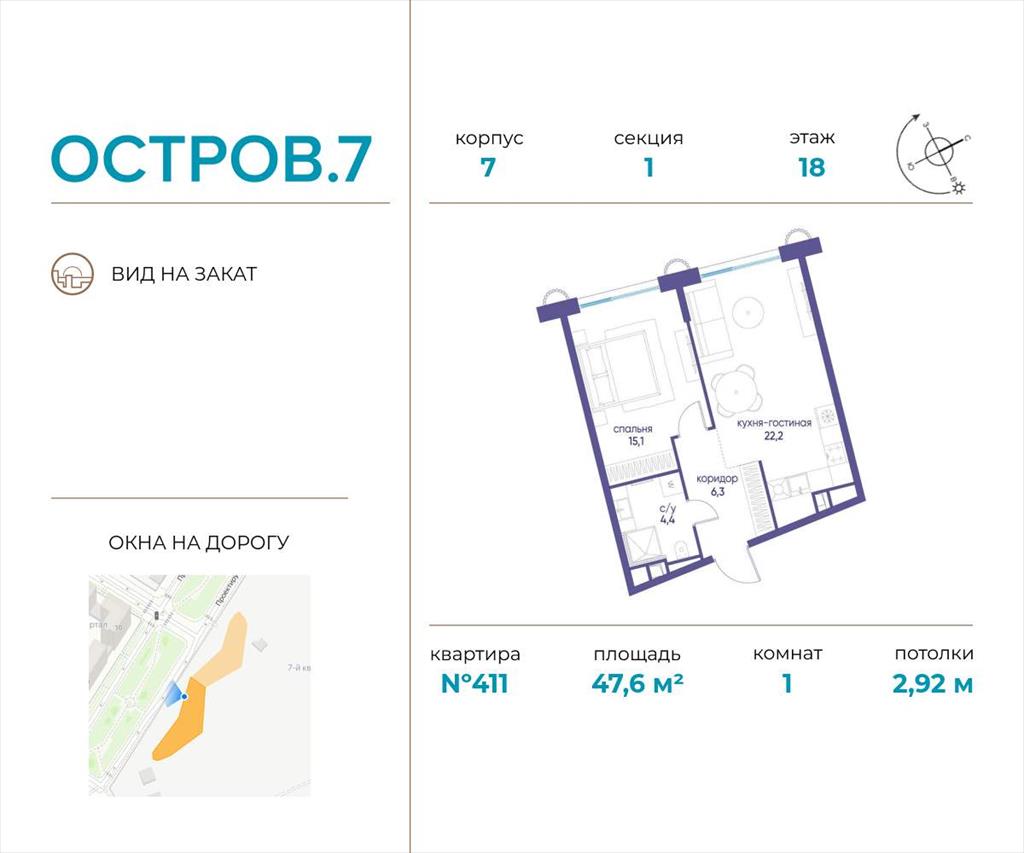 | Продаётся 1-комн. квартира от застройщика: общая площадь 47.60 м, жилая 15.10 м, кухня 22.20 м, 18-й этаж, жилой квартал «Остров 7», корпус 7 (секция 1) . Срок сдачи: 3 квартал 2028 года.
