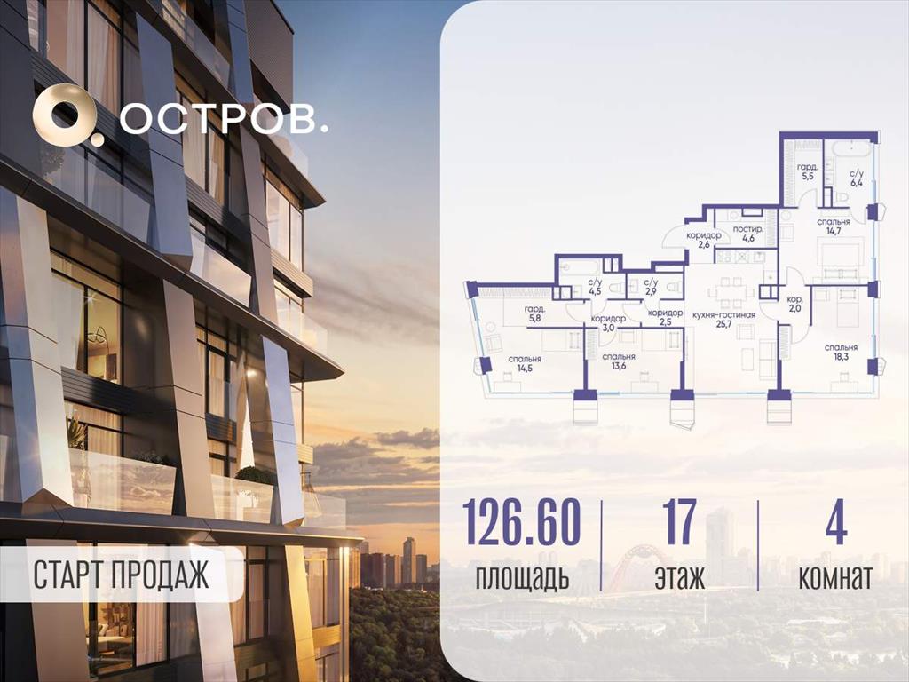 | Продаётся 4-комн. квартира от застройщика: общая площадь 126.60 м, жилая 61.10 м, кухня 25.70 м, 17-й этаж, жилой квартал «Остров 12», корпус 3 (секция 1) . Срок сдачи: 1 квартал 2029 года.