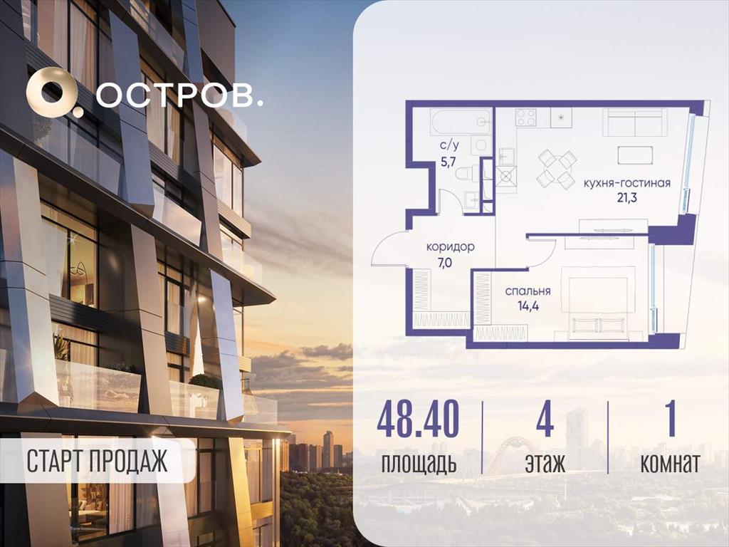 | Продаётся 1-комн. квартира от застройщика: общая площадь 48.40 м, жилая м, кухня м, 4-й этаж, жилой квартал «Остров 12», корпус 1 (секция 2) . Срок сдачи: 1 квартал 2029 года.