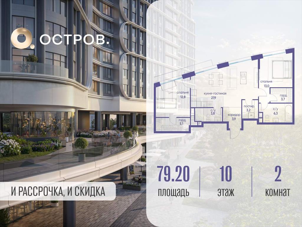 | Продаётся 2-комн. квартира от застройщика: общая площадь 79.20 м, жилая 25.80 м, кухня 27.90 м, 10-й этаж, жилой квартал «Остров 7», корпус 1 (секция 1) . Срок сдачи: 1 квартал 2028 года.