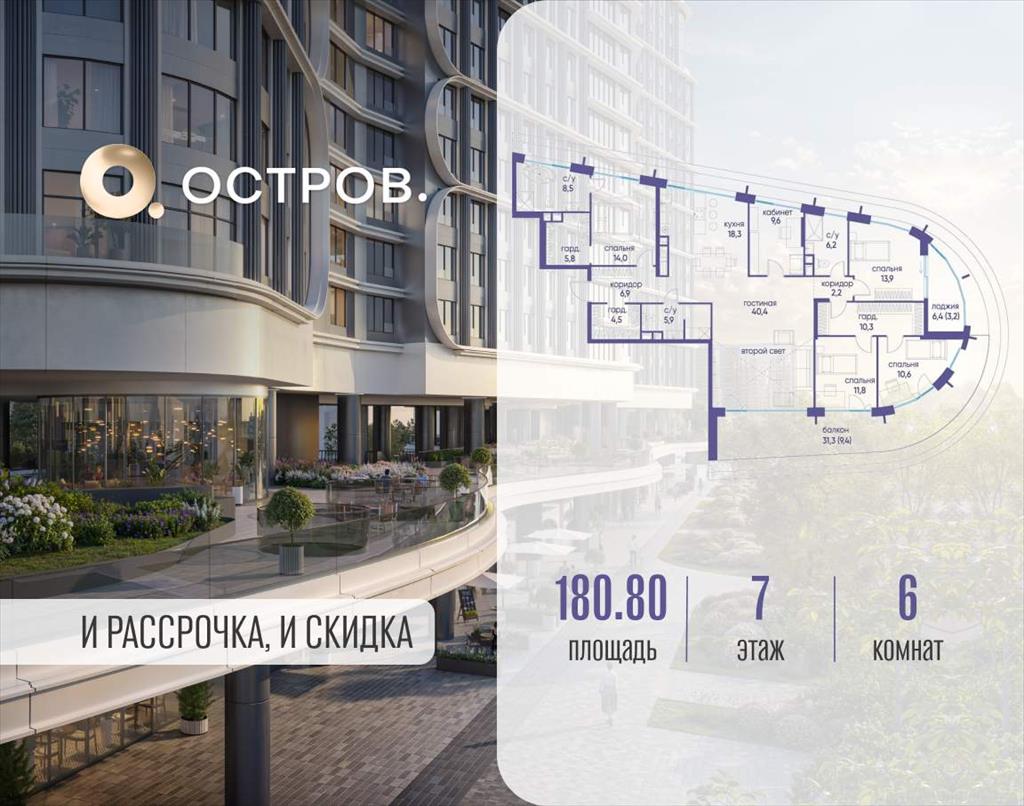 | Продаётся квартира от застройщика: общая площадь 180.80 м, жилая 59.90 м, кухня 58.70 м, 7-й этаж, жилой квартал «Остров 7», корпус 5 (секция 1) . Срок сдачи: 3 квартал 2028 года.