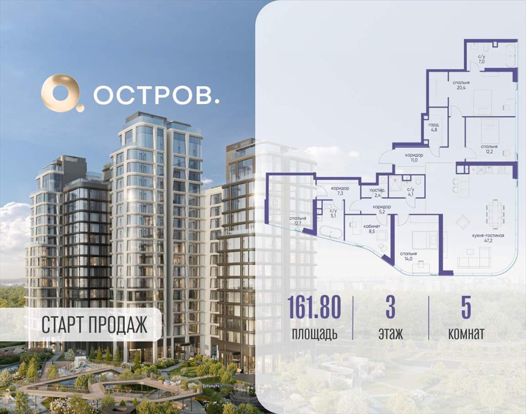 | Продаётся квартира от застройщика: общая площадь 161.80 м, жилая 67.80 м, кухня 47.20 м, 3-й этаж, жилой квартал «Остров 12», корпус 3 (секция 6) . Срок сдачи: 1 квартал 2029 года.